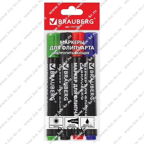 Маркеры для флипчарта BRAUBERG, НАБОР 4 шт., НЕПРОПИТЫВАЮЩИЕ, АССОРТИ, круглые, 2,5 мм, 151257