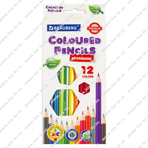 Классические деревянные цветные карандаши премиального качества BRAUBERG PREMIUM серии "Color" обеспечивают гладкое письмо благодаря экстрамягкому грифелю. Особое качество красящего пигмента обеспечивает насыщенные яркие цвета. Набор состоит из 12 цветов: черный, синий, голубой, салатовый, зеленый, желтый, оранжевый, розовый, красный, серый, фиолетовый, коричневый. Шестигранная форма сечения корпуса позволяет не скатываться карандашу с поверхности стола во время занятий рисованием. Они изготовлены из древесины ценных пород и имеют лакированный корпус. Высокосортная древесина и качество исполнения гарантируют легкую заточку. Грифель диаметром 3,3 мм обладает повышенной прочностью. Все карандаши заточены и поставляются в картонной упаковке с европодвесом.