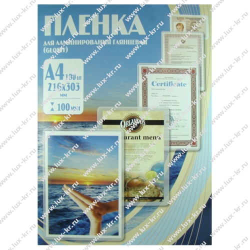 Пленка для ламинирования 216х303 мм, 100 листов в упаковке. Предназначена для горячего ламинирования. Пленка антистатичная, глянцевая, имеет закругленные углы.