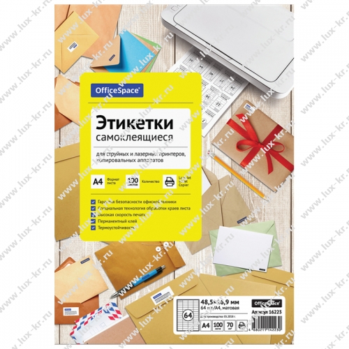 Этикетки самоклеящиеся А4 OfficeSpace, белые, 64 фр. (48,5*16,9), 70г/м2