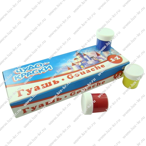 Гуашь редназначена для детского творчества. Краски на водной основе, безвредны, легко смываются с рук и одежды, в прозрачных баночках, с навинчивающейся крышкой. Картонная упаковка типа "сундучок".