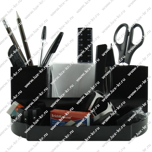 14 предметов: ножницы, нож канцелярский, степлер, скобы, антистеплер, 2 карандаша, 2 ручки, скрепки, ластик, точилка, линейка, блок бумаги для записей. Невращающийся.