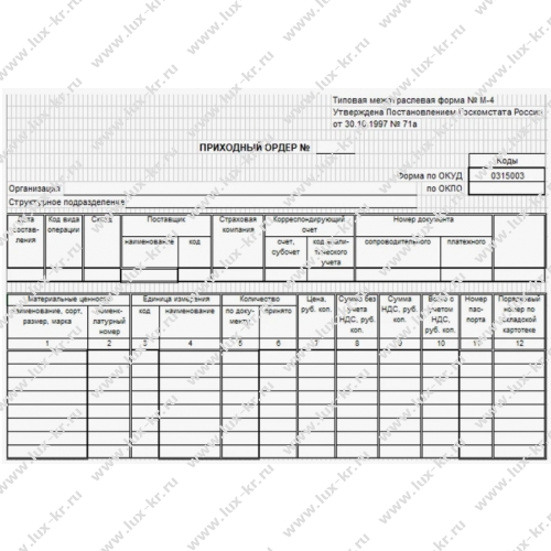 Типовая межотраслевая форма № М-4, приходный ордер, 100 листов.