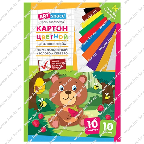Картон цветной А4, ArtSpace, 10л., 10цв., немелованный, золото, серебро, в папке, "Волшебный. Медвежонок"