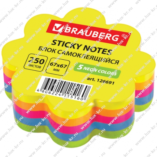 Блок самоклеящийся (стикеры), фигурный, BRAUBERG, НЕОНОВЫЙ "Цветок", 250 листов, 5 цветов, 126691