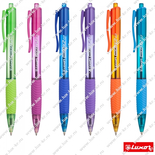 Автоматическая шариковая синяя ручка Luxor Micra,чернила шариковой ручки на масляной основе пониженной вязкости обеспечивают мягкое ровное письмо и уверенное скольжение по бумаге. Мягкий резиновый грип снижает давление на пальцы рук при письме. Легкий корпус лаконичен по форме и удобен при письме, ассорти по цвету. Диаметр пишущего узла 0,7 мм., длина стержня 11 см.