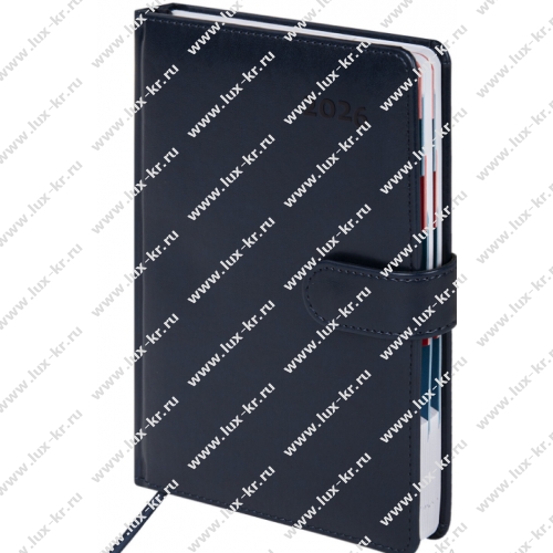 Датированный ежедневник формата А5 (148х218 мм), внутренний блок включает 168 листов белой бумаги плотностью 70 г/м2. Каждая страничка имеет перфорированный угол. Твердая обложка темно-синего цвета прошита по периметру и стилизована под гладкую кожу. Обложка фиксируется магнитной застежкой, поэтому ежедневник не откроется в сумке или портфеле и страницы не помнутся. Материал обложки подходит для горячего тиснения.