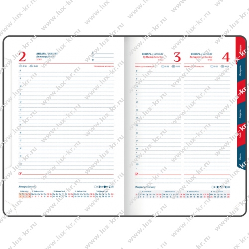Дополнением является закладка-ляссе, с помощью которой при необходимости можно быстро открыть ежедневник на нужной странице, а также вырубка по месяцам.