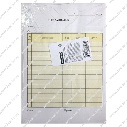 Бухгалтерский бланк двухслойный самокопирующийся "Накладная" формата А5. Самокопирующийся бланк изготовлен из самокопирующейся бумаги. На верхний лист текст наносится обыкновенной ручкой, карандашом или матричным принтером. Оттиск черного цвета появляется одномоментно на нижележащем листе. Бланки изготовлены из офсетной бумаги и склеены в книгу по 50 листов, упакованную в пленку.