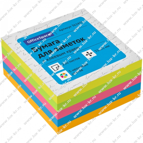 Блок бумаги для записей с клеевым краем, плотность бумаги для заметок составляет 75 г/м2. Размер листа в блоке для заметок 51*51 мм. В блоке 250 листов пяти неоновых цветов.