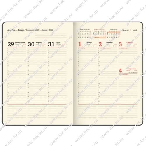 Датированный еженедельник А4 формата в твердой обложке коричневого цвета, внутренний блок включает 64 листа кремового цвета.
