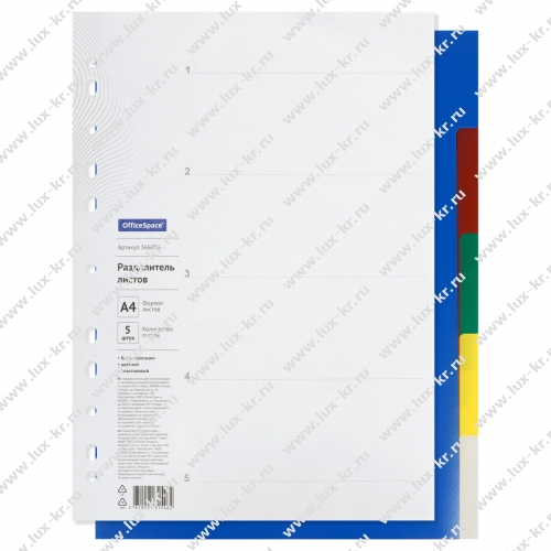 Разделитель листов OfficeSpace А4, 5 листов, без индексации, цветной, пластиковый 366056