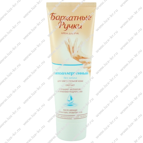 Крем для рук Бархатные Ручки гипоаллергенный уменьшает признаки раздражения и устраняет шелушение. Благодаря своей гипоаллергенной формуле без отдушки идеально подходит даже для ухода за чувствительной кожей рук.